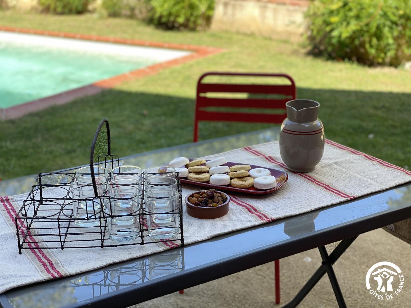 À proximité, profitez des vignobles du Roussillon, des sentiers de randonnée serpentant la garrigue, et des villages typiques tels que Castelnou, classé parmi les plus beaux de France. Dans la nature, Nichée au bout d’un chemin goudronné sur 2 km, cette maison d’hôtes de caractère, autrefois domaine viticole, a su préserver son histoire en se consacrant désormais à la culture des olives de variété catalane. La demeure, mitoyenne à quelques habitations, séduit par sa sérénité et son charme d’antan et ses espaces extérieurs non clôturés. Vous apprécierez la piscine partagée, non chauffée, de 3 x 4 x 1.60 m, accessible de 10h à 20h, de juin à septembre. Profitez également des terrasses et espaces extérieurs au cœur de la nature. Les petits-déjeuners vous seront servis à la salle à manger située au rez-de-chaussée, tandis qu’aux beaux jours, vous les dégusterez sur la terrasse en étage. L’escalier de meunier d’origine mène à une bibliothèque avec poêle à bois, véritable cocon pour vo