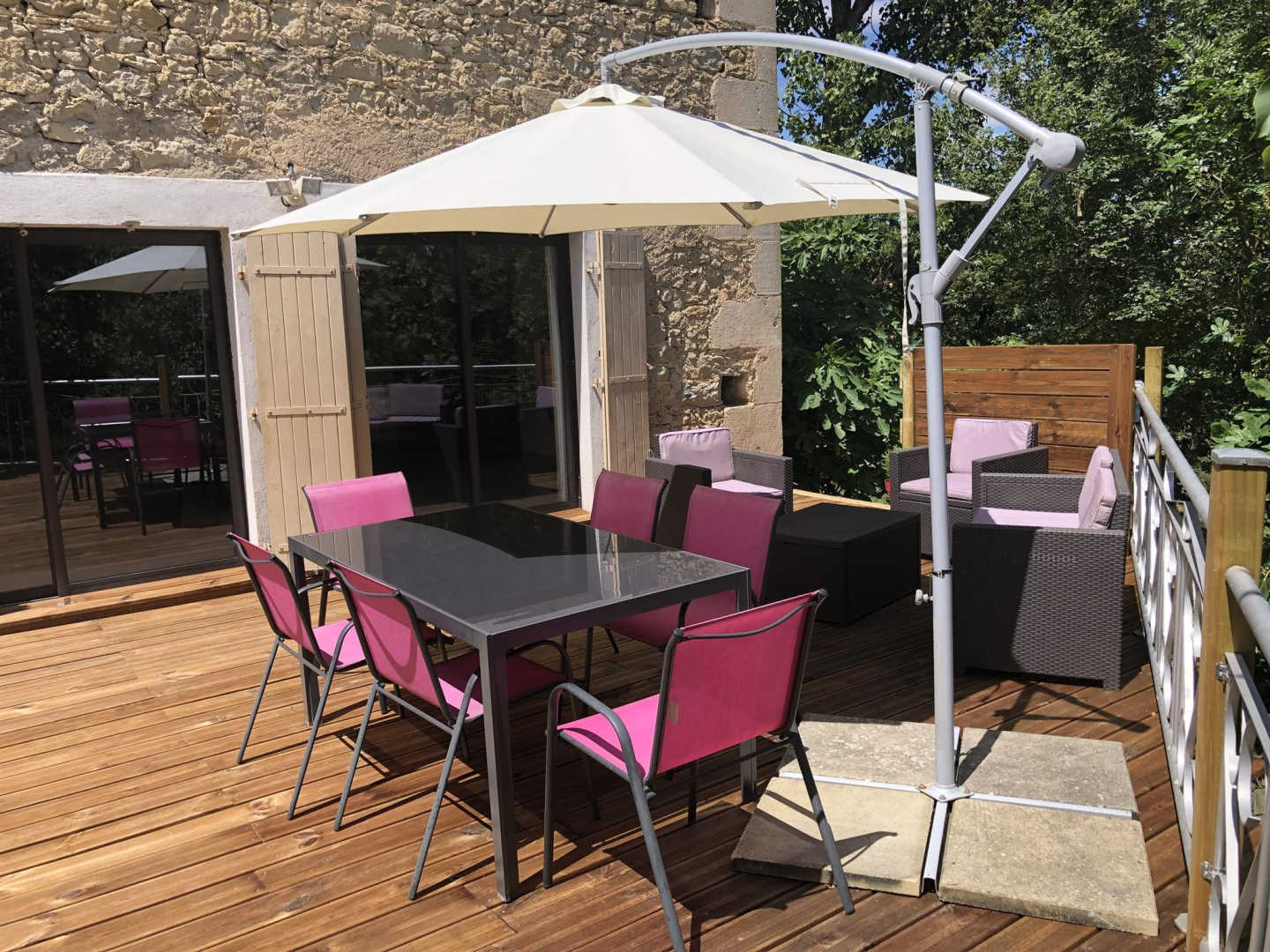 Gîte adjoining another gîte and the owners’, it enjoys an independent entrance. On the ground floor : living-rm-cum-fitted kitchenette, lounge, wc. Upstairs : 1 bdrm (1 bd 5ft2), 2 bdrms (2 single bds each), wc, bathrm. Electric heating. DVD. Towels & house linen supplied, bds done. This characterful rural gîte, fully in the countryside, has been set up in a former barn and tastefully renovated. Situated up a hillock, it will grant you a magnificent panorama over the medieval village of Lautrec, one of the main production site for pink garlic. You will enjoy the quietness of premises. The children will enjoy sharing the numerous leisure equipments in common, whereof swimming-pool(11x6m), trampoline, ping-pong, badminton, bikes, mountain bikes.