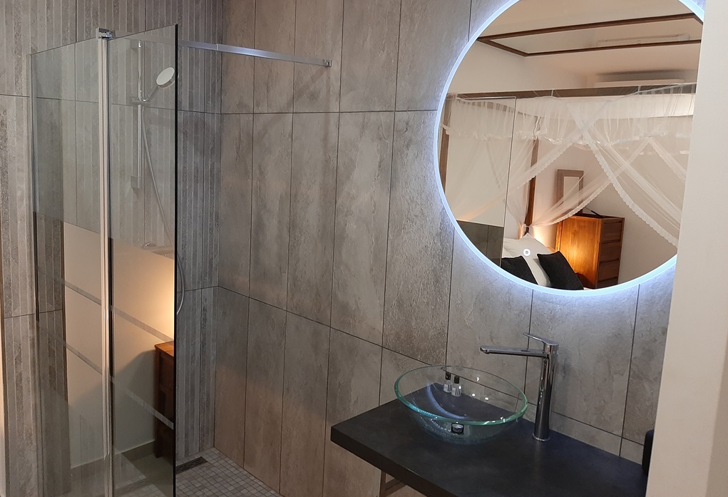 Chambres d’hôtes de caractère où vous pourrez séjourner en toute tranquillité. Les 5 chambres sont chacune pour 2 personnes. L’une des chambres (Love Room Baobab) dispose d’un jaccuzzi et d’un sauna privatifs. Profitez d’un moment de détente à la piscine, ou bien dans le jardin aménagé. Vous trouverez tout le confort possible pour une escapade réussie. Idéal pour un séjour en couple. La piscine dispose de transats avec parasol. “Vous avez la possibilité de bronzer avec ou sans traces de maillots au bord de la piscine”. Un terrain de pétanque ainsi qu’une table de massage sont à votre disposition. Les propriétaires peuvent vous donner les contact de masseurs professionnels. Vous pourrez également découvrir l’art et l’artisanat malgache dans la boutique de madame. ATTRAITS TOURISTIQUES : Cap d’Agde, Marseillan, Sète, l’étang de Thau (parcs ostréicoles), Béziers, Pézenas, Canal du Midi, sports nautiques, plages. – Voyagez dans l’océan Indien à Madagascar : Chambre de 14m², lit 14×200, climatisation reversible. Salle d’eau avec douche à l’italienne. Toilette privatif indépendant de la salle d’eau.