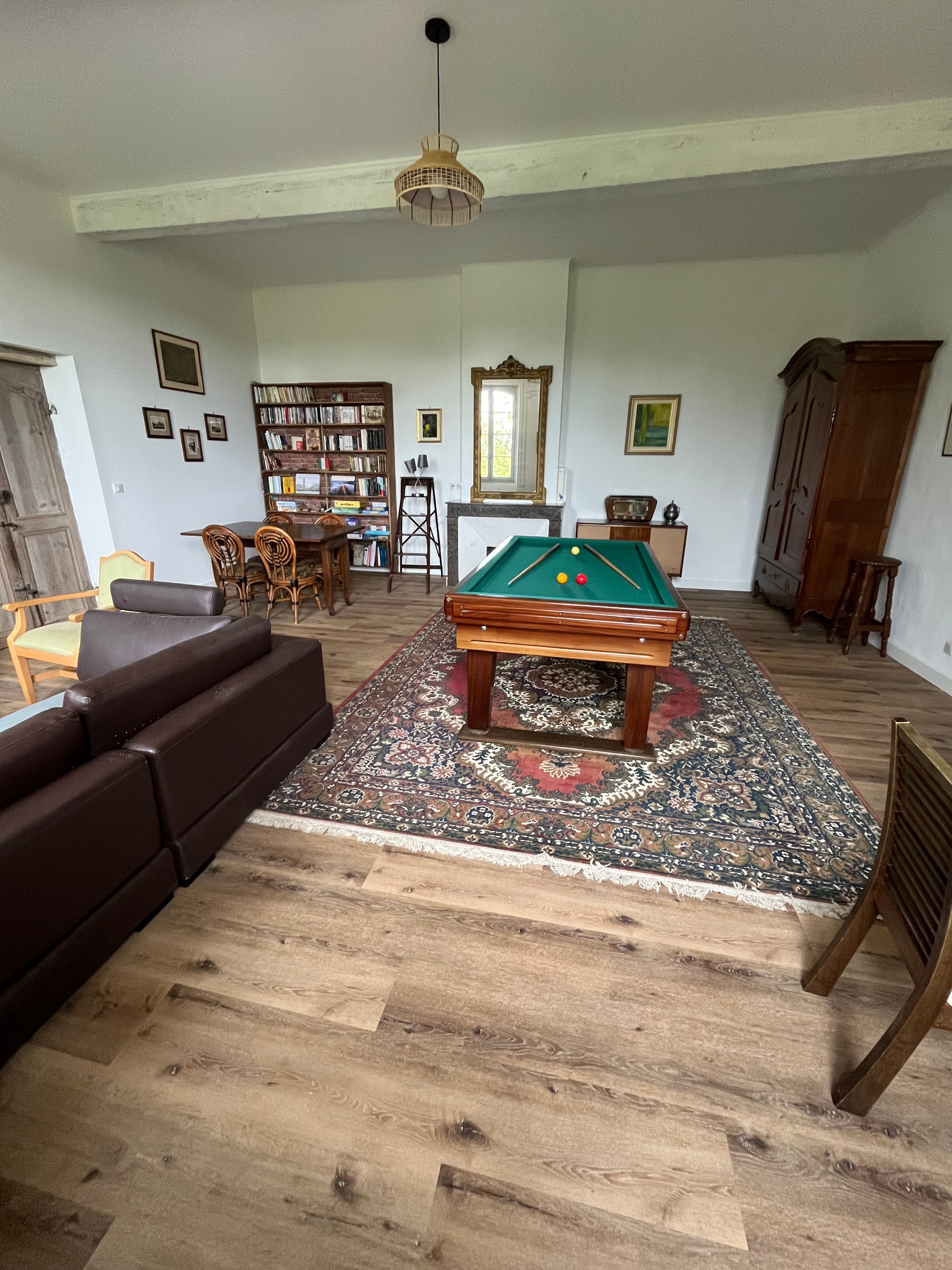 The ground floor comprises a kitchen (fitted units, oven, fridge, freezer, hob, dishwasher), with flexible dining area, pantry (washing machine, additional fridge). One bedroom (1 x 200cm bed, 1 x 0.90cm bed), shower room with wc. A lounge/library (2 sofas, one of which converts to 160cm, armchairs), 1 separate WC (washbasin). Dining room (table, chairs, sitting area). 1st floor: 1 bedroom (1 x 200cm bed, 1 x 160cm bed), shower room and separate toilet. 1 bedroom (3 single beds 0.90 x 200), with access to a shower room and separate toilet. At the top of the stairs, a reading area and children’s play area (BZ 130 x 190). Huge games room with pool table, games table, TV area and books. Wifi throughout. Terrace with garden furniture and lounge. Barbecue. Parasol. Swimming pool shared with the owner, sun loungers, deckchairs. Enclosed indoor parking.