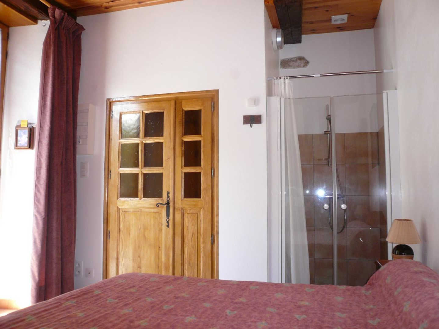 Chambre avec un lit double, salle d’eau, wc et bureau.