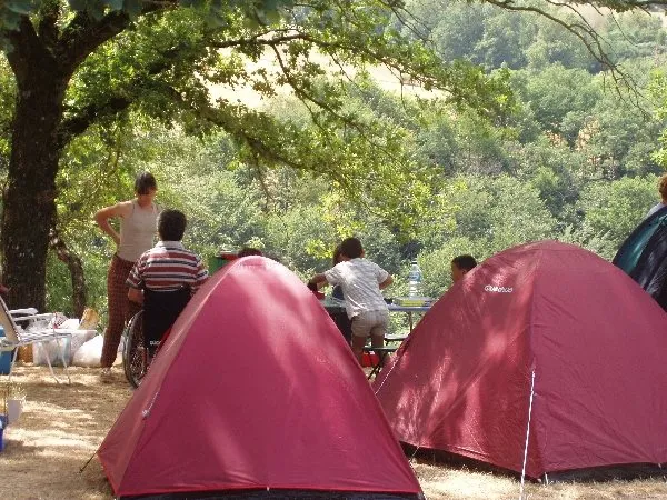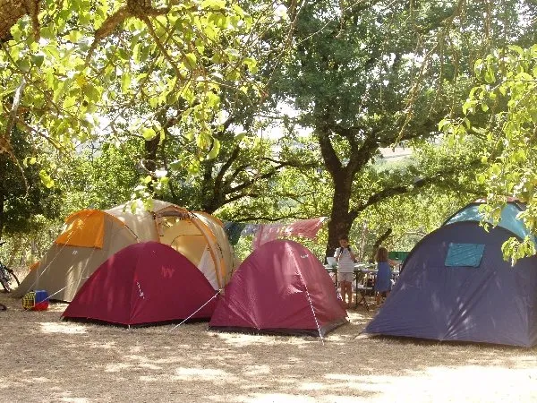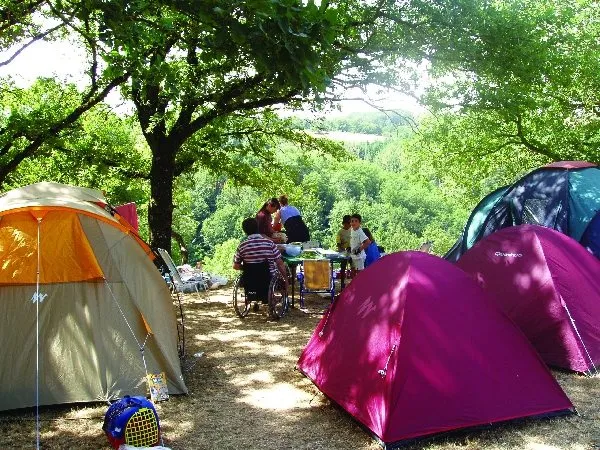 Terrain ombragé par de grands chênes, calme, ambiance conviviale, vue imprenable sur une petite vallée.