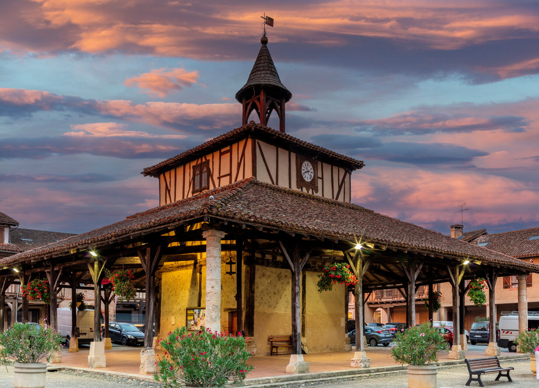 Sa place, entourée de couverts et de maisons du XVe et XVIe siècles où pierre et brique se marient harmonieusement, comprend, en son centre une halle du XIVe siècle surmontée d’un petit beffroi à «couverture en poivrière» et qui abrite une mesure à grain en pierre du XVe siècle.