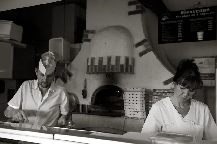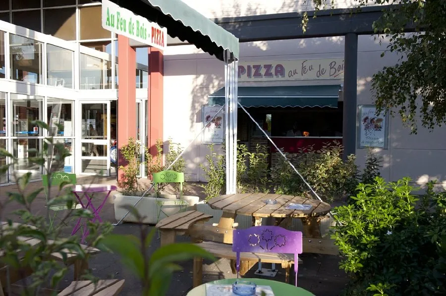 Pizzas à emporter ou à consommer sur place (terrasse extérieure).