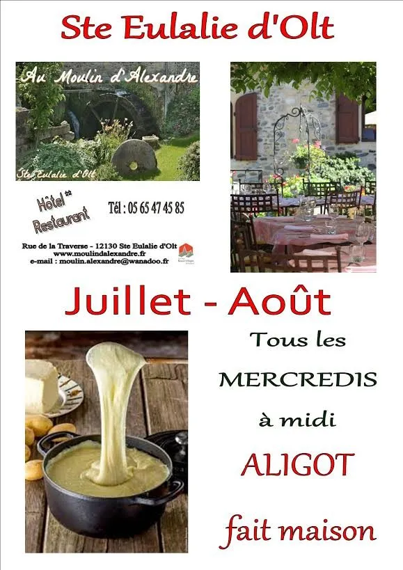 En juillet et en août : aligot maison mercredi midi et poulet fermier et frites maison de nos producteurs locaux le lundi midi.