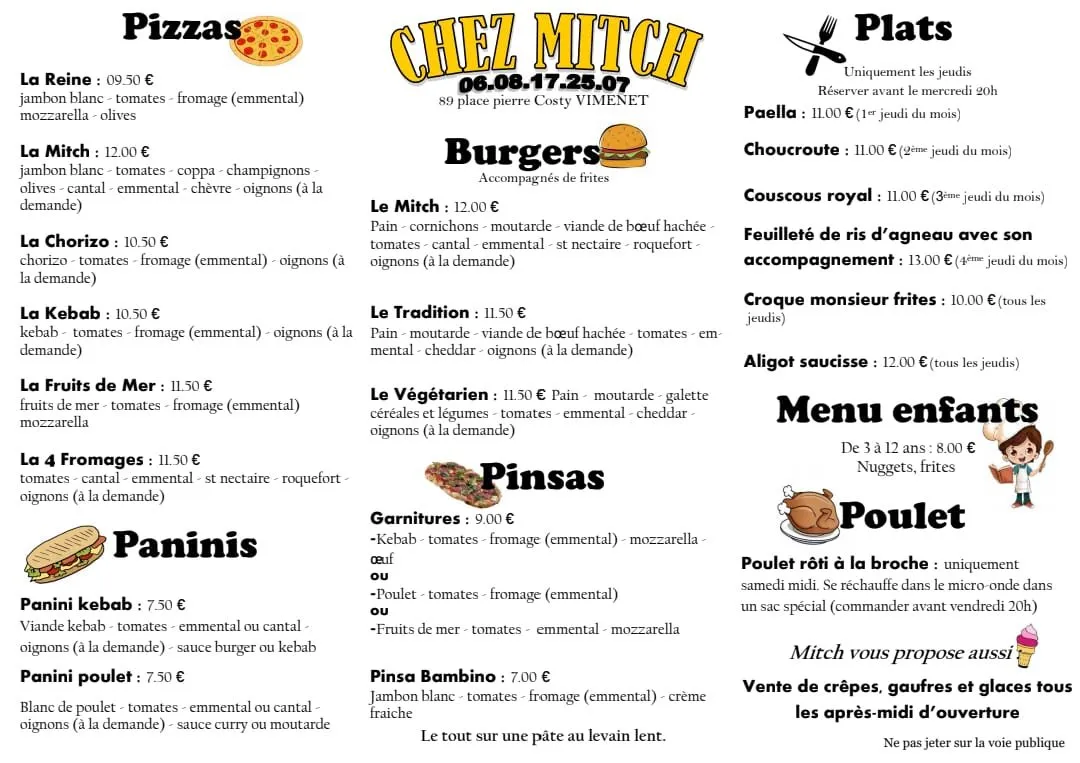 “Chez Mitch” vous aurez le choix parmi des pizzas, paninis, burgers ou pinsas. Mitch vous propose aussi des crêpes, gaufres et glace tous les après-midi d’ouverture.