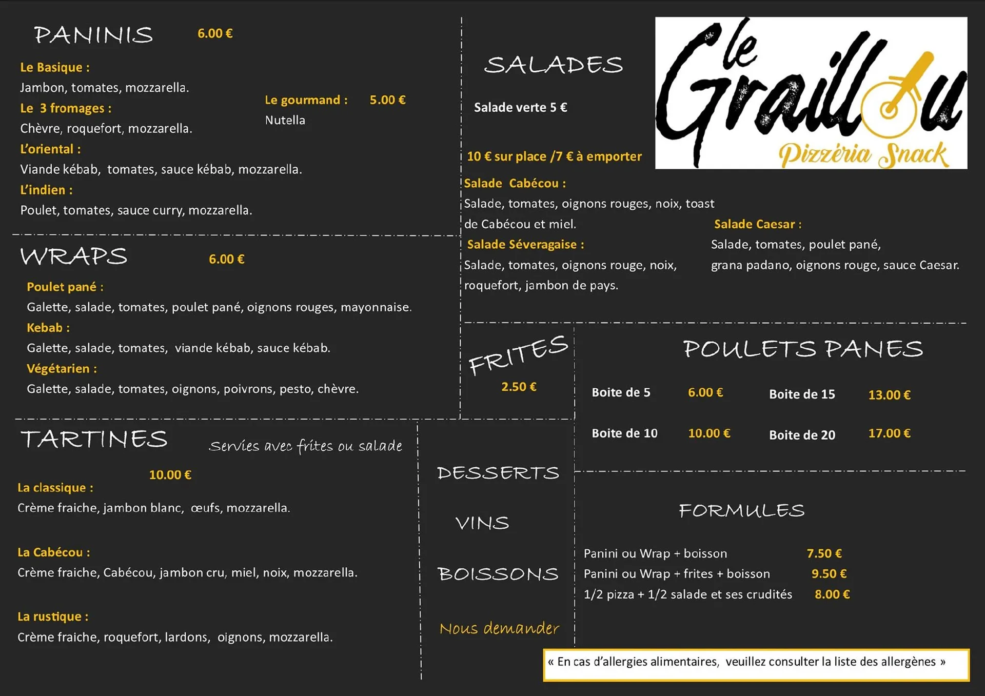Pizzas, wraps, salades, paninis, frites, tartines et desserts à la carte ou en formule.