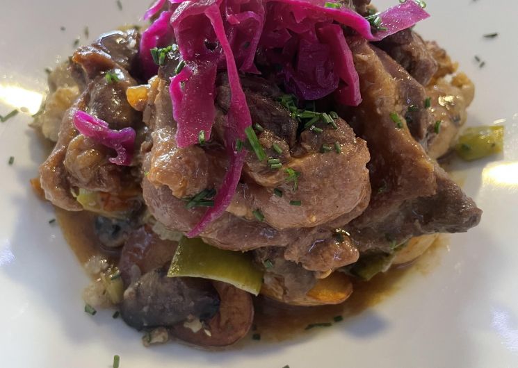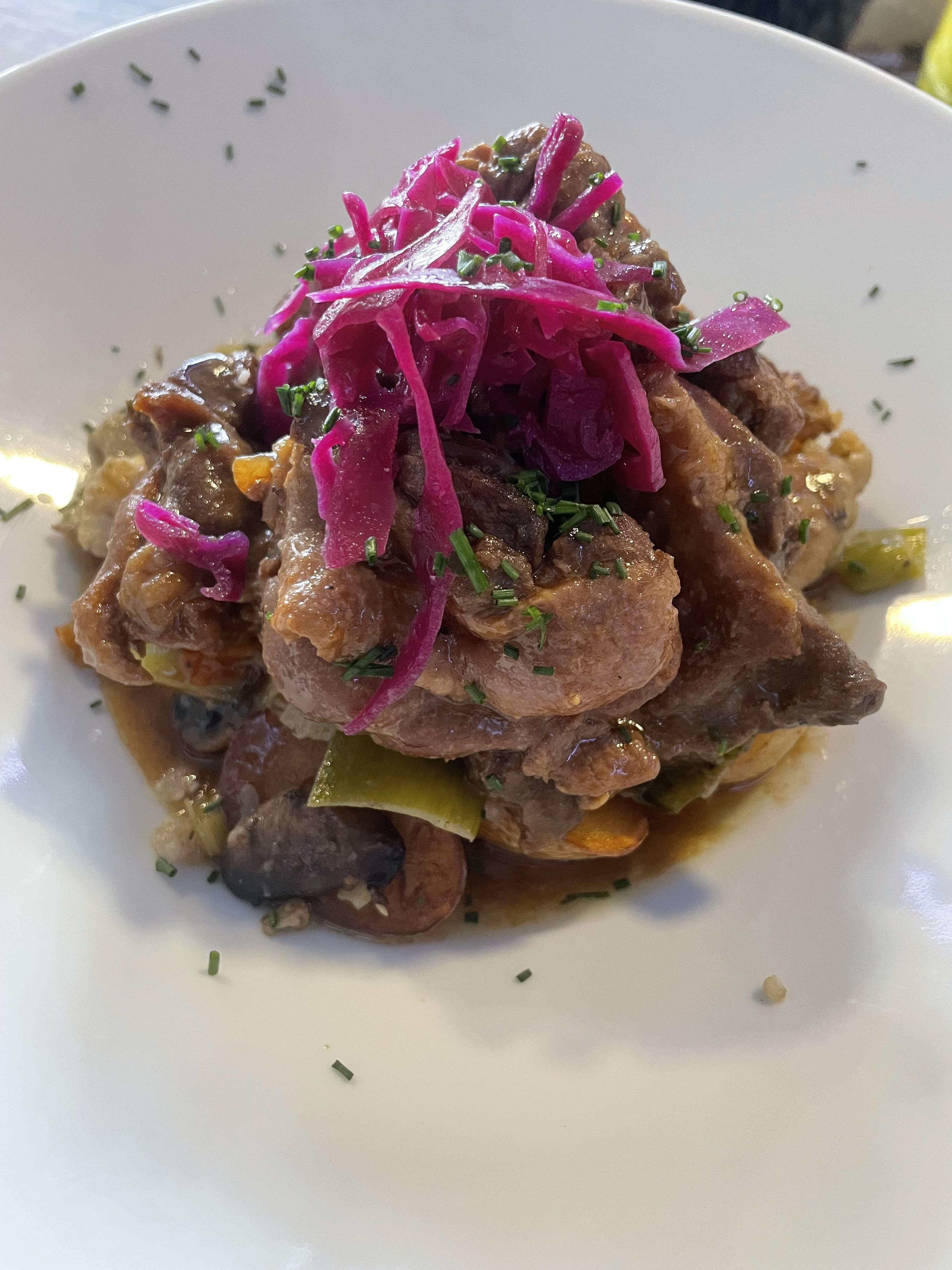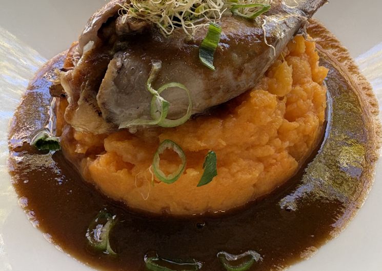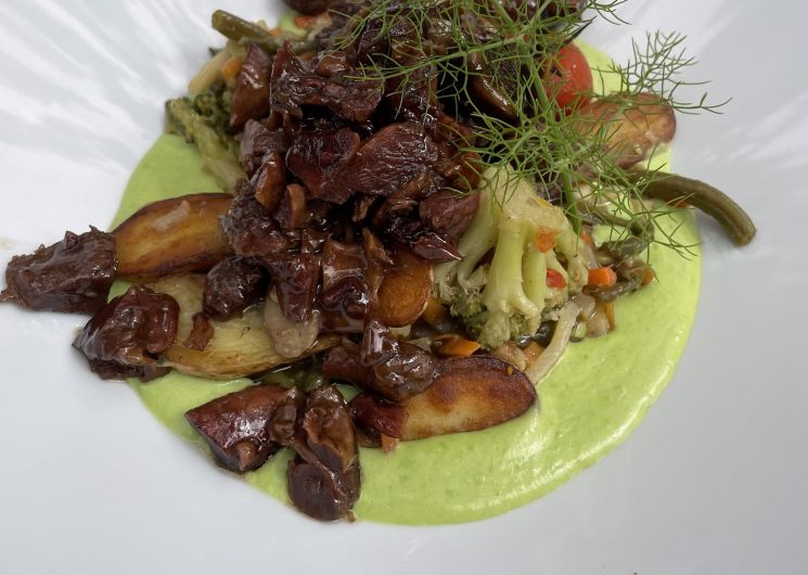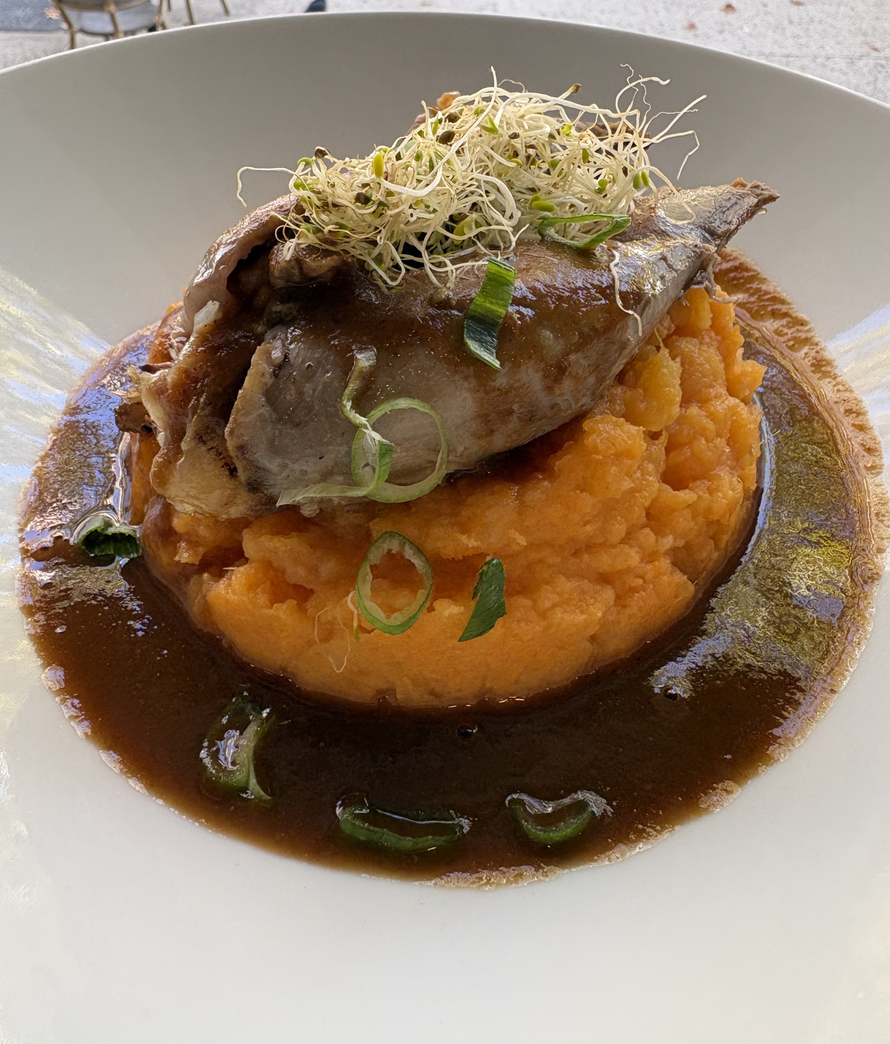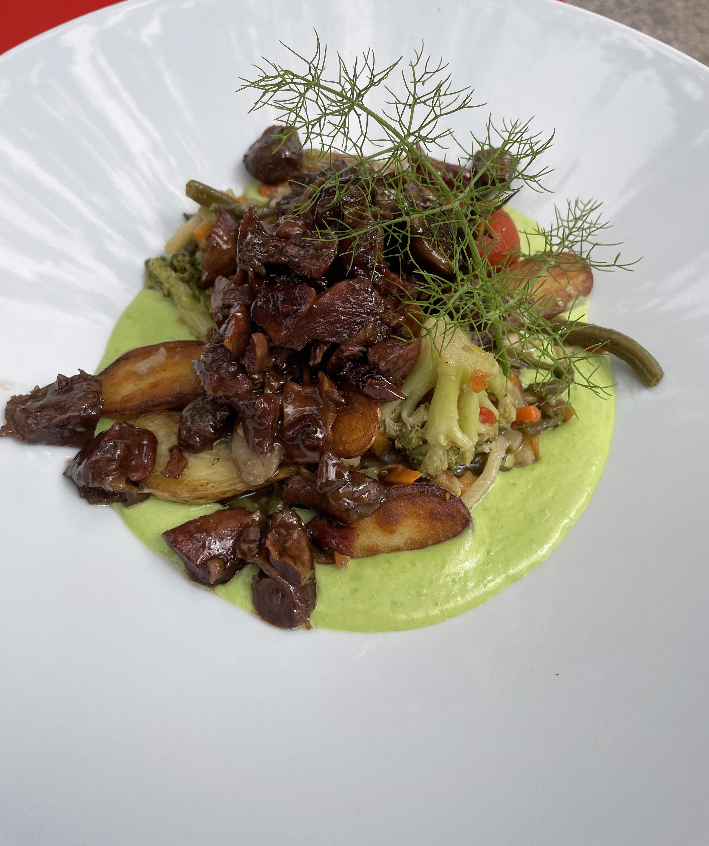 Terrasse ombragée. Produits de saison du marché ainsi que des commerçants locaux et producteurs.