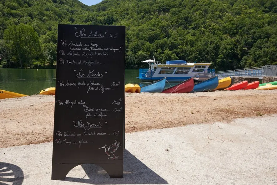 Une carte de grillades, de salades repas, de charcuteries et fromages d’ici, sur une terrasse au bord des eaux du Tarn.